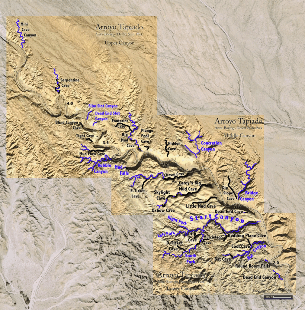 The Mud Caves are located in the Arroyo Tapiado area of the Carrizo Badlands, in the southern section of Anza-Borrego Desert State Park.